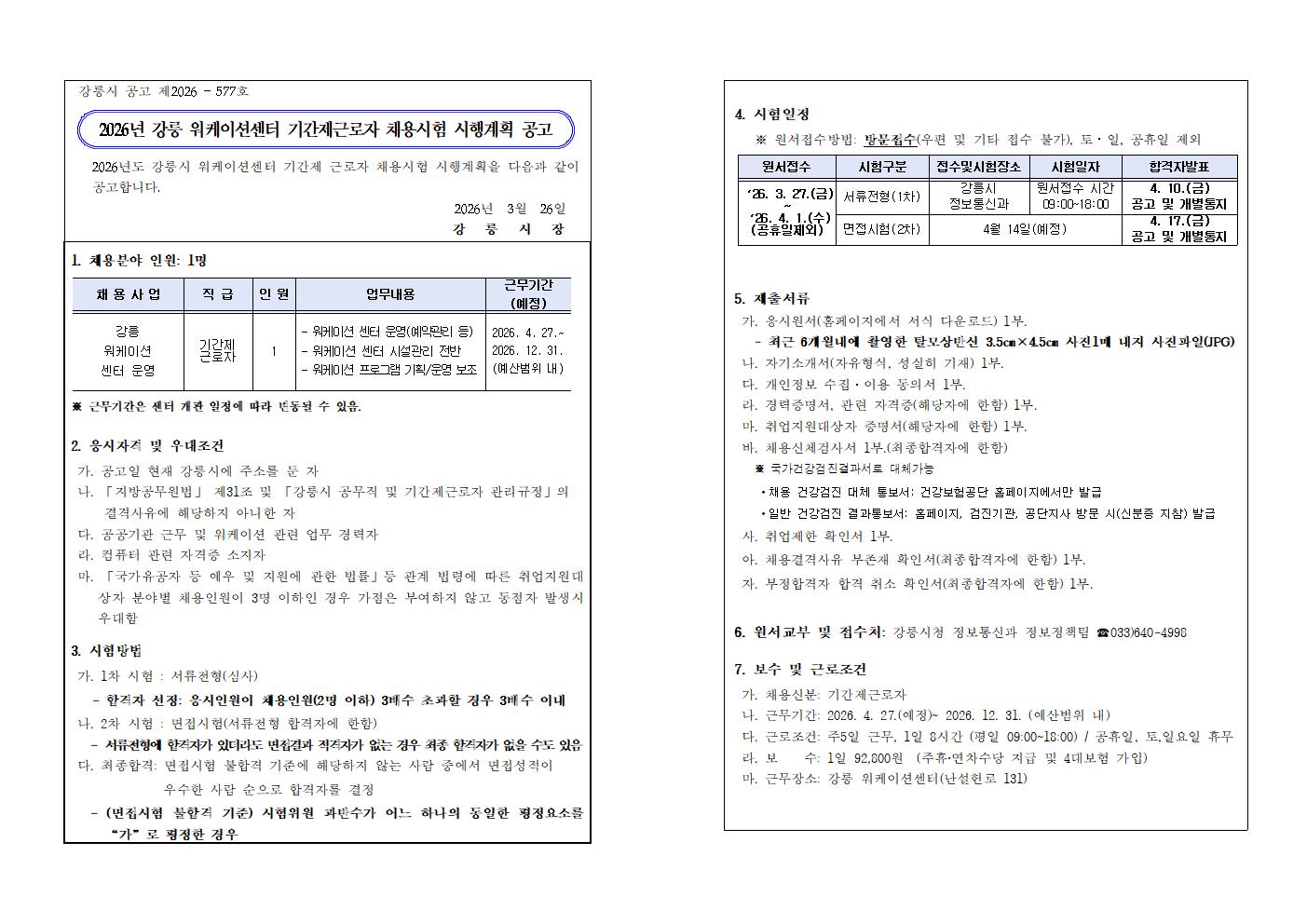 2026년 강릉 워케이션센터 기간제근로자 채용 공고