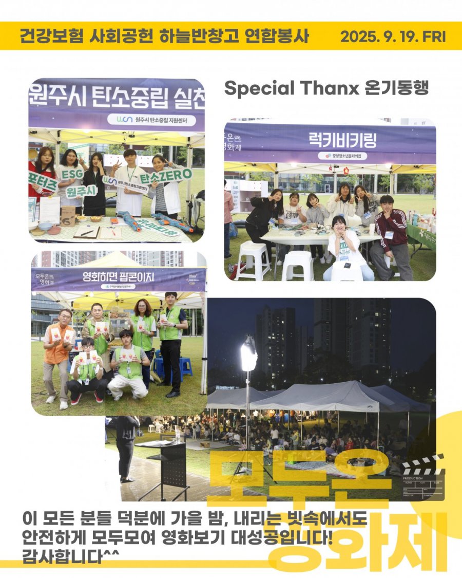 지난 9월19일(금)  "2025년 모두온영화제"에 사회복지학과 재학생 12명이 자원봉사자로 참여하여 활동하였습니다.